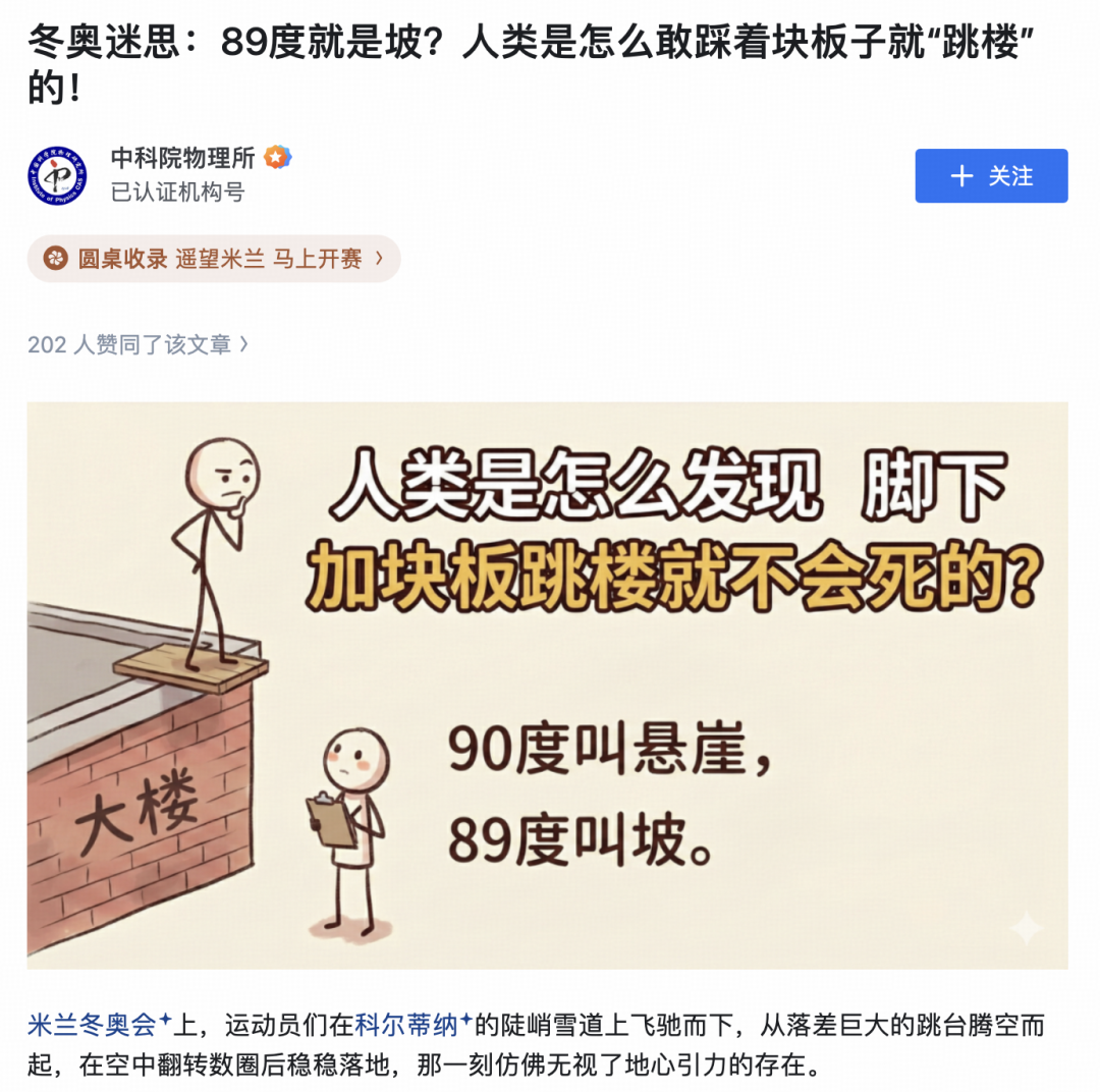 89度就是坡?人类是怎么敢踩着块板子就“跳楼”的!面对这个“人类怎么敢踩着板子跳楼”的冬奥迷思,引得了中科院物理所的亲自下场科普:运动员以高速撞向地面,速度在千分之几秒内降为零,作用时间极短,冲击力会瞬间爆表——这就是为什么“90度叫悬崖”,跳下去必死无疑。